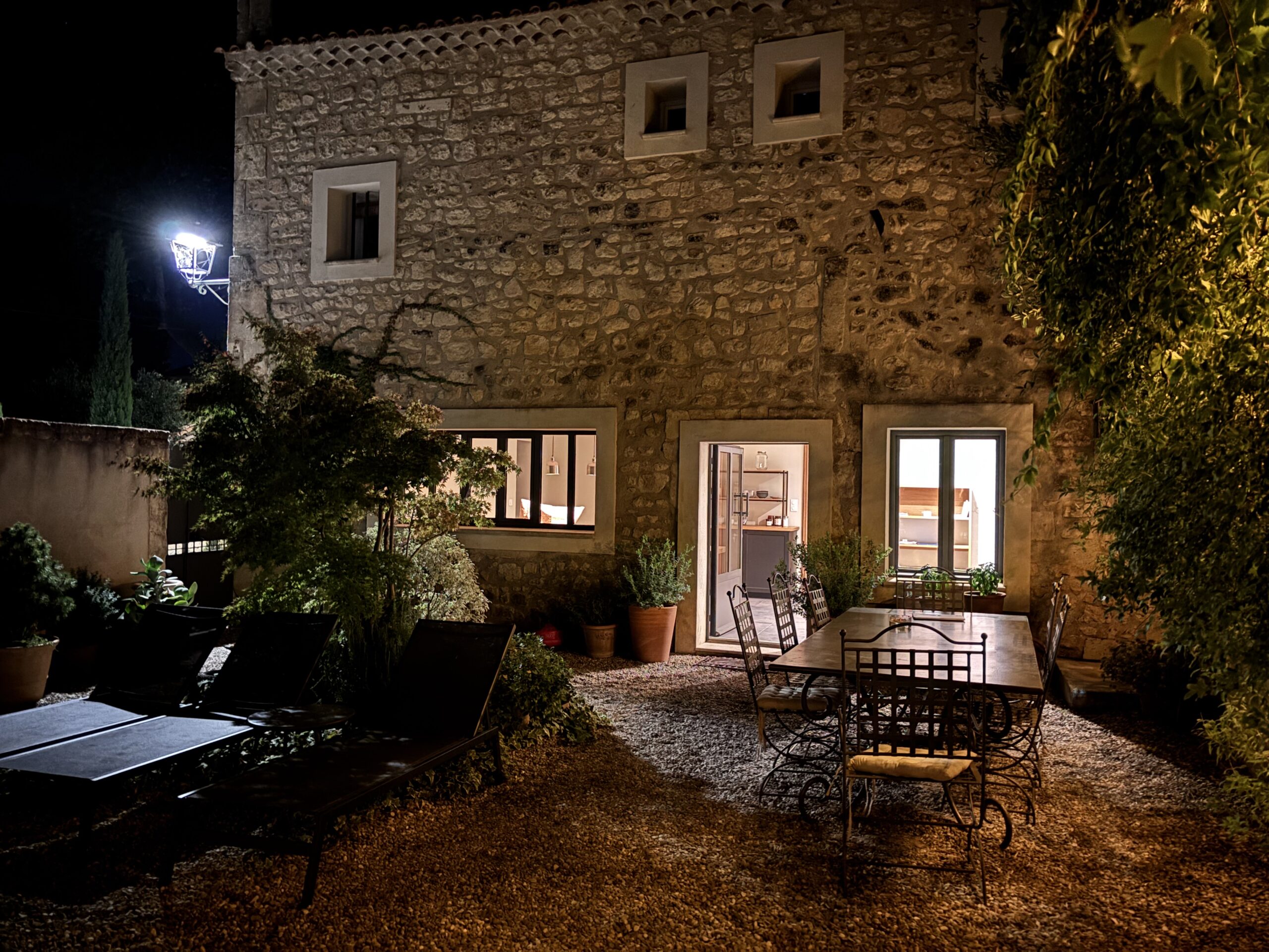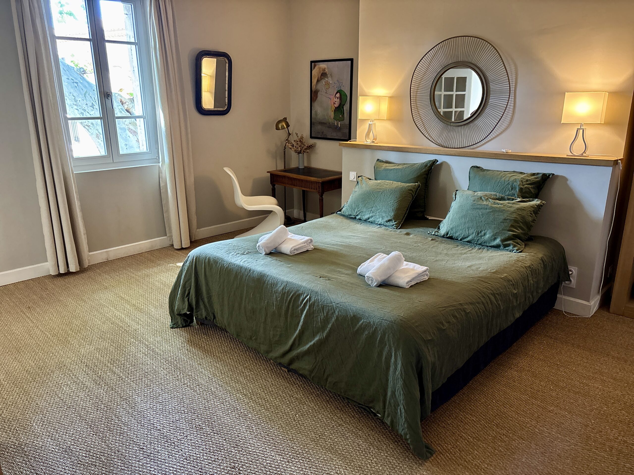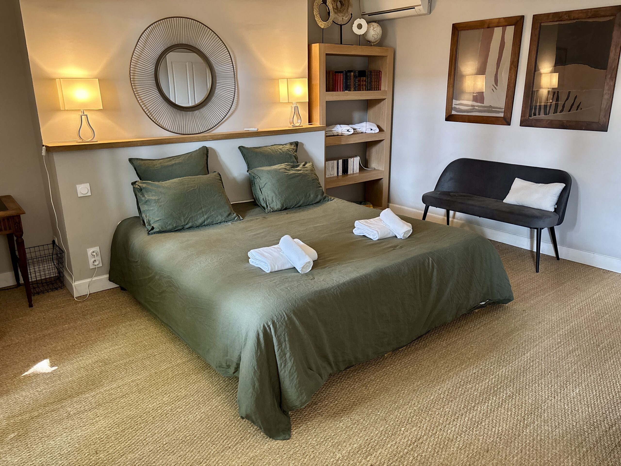 Située au premier étage, lit king size (180×200), climatisation, cafetière Nespresso, dressing, mini réfrigérateur, coffre fort, salle de bains avec douche à l’italienne et une petite vue sur les Alpilles ! Peignoirs, produits de bain, linge de maison.