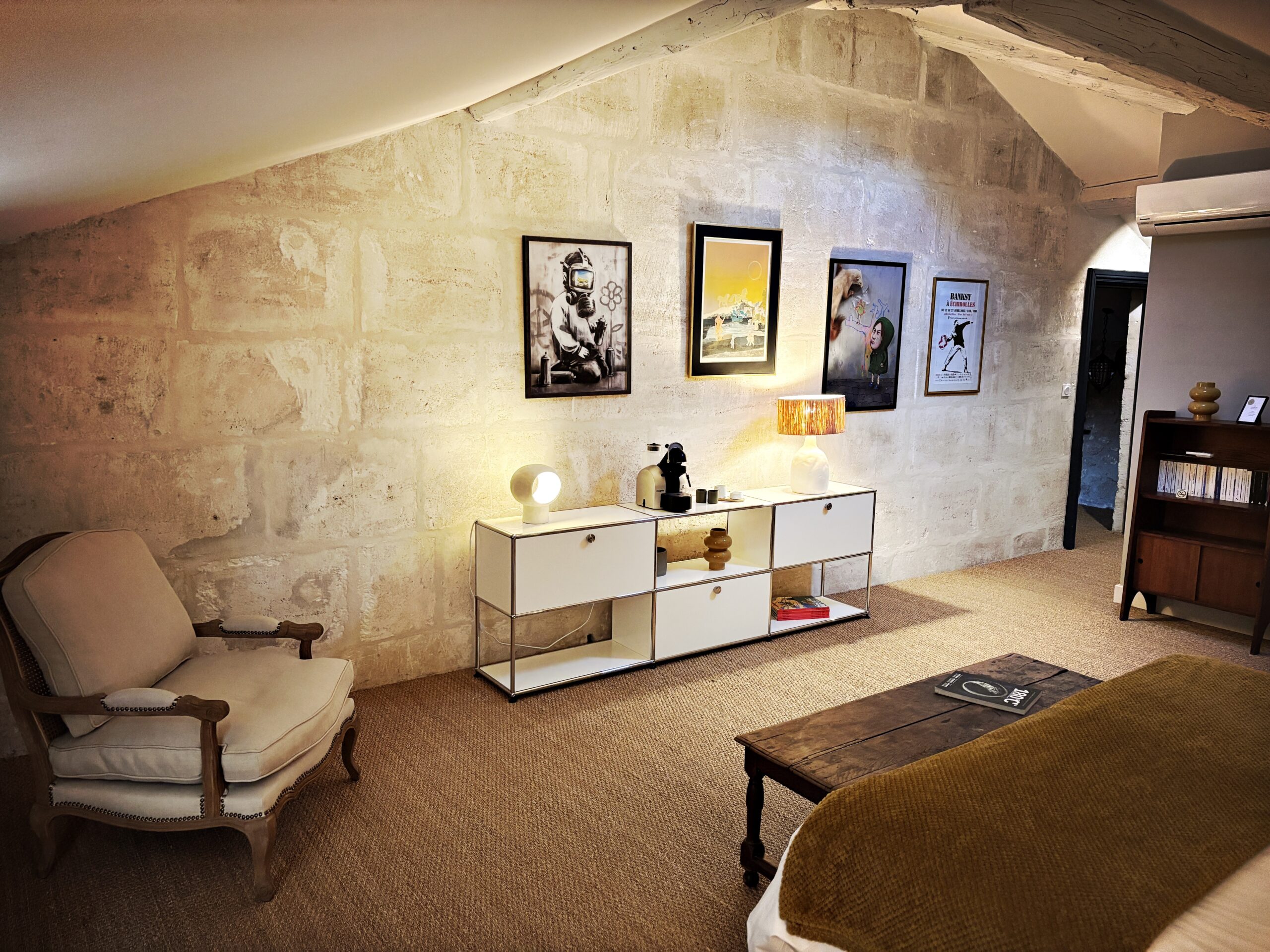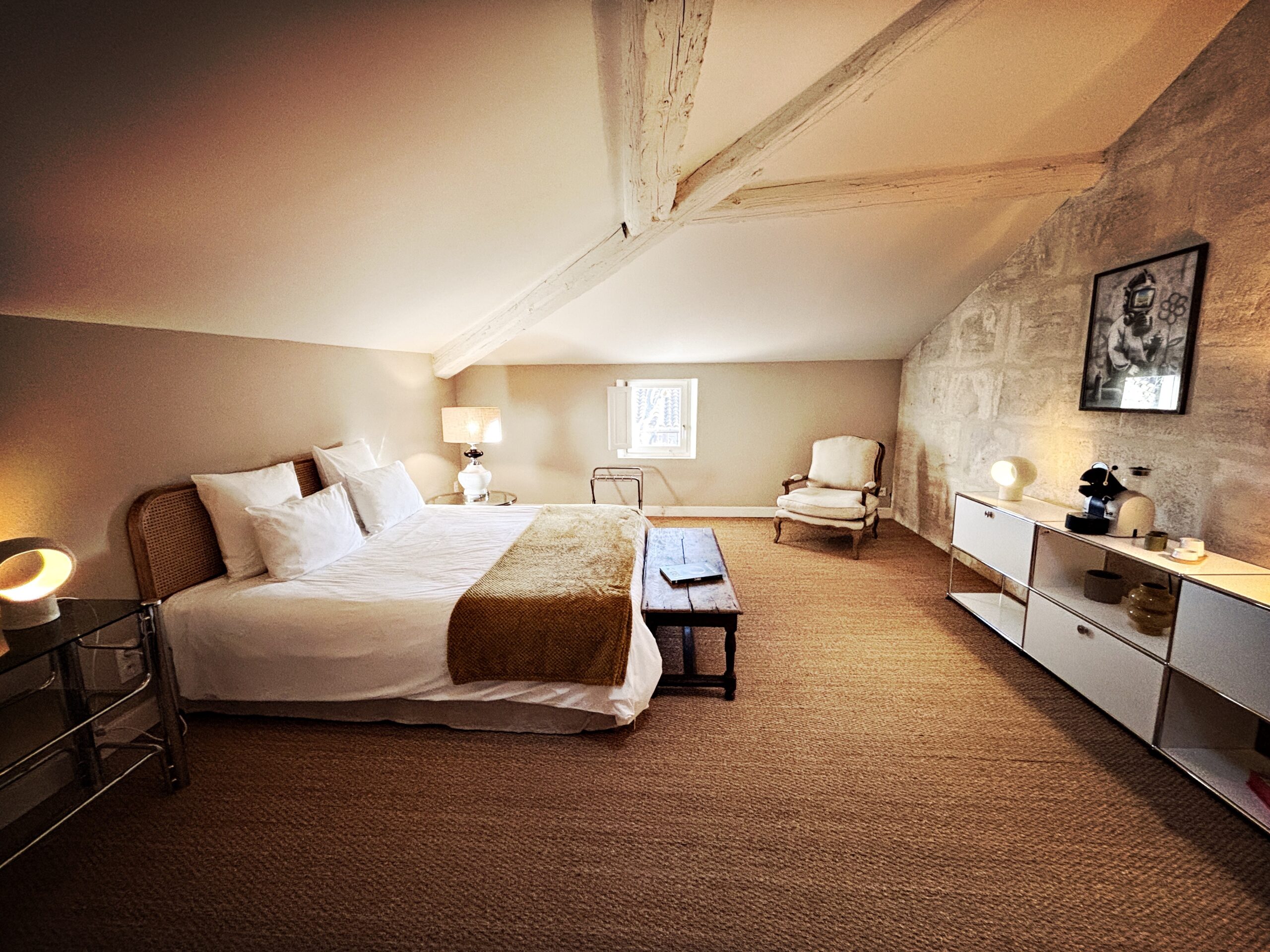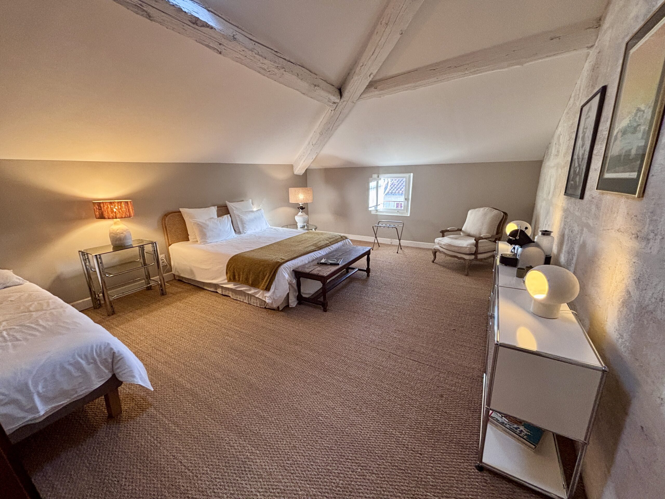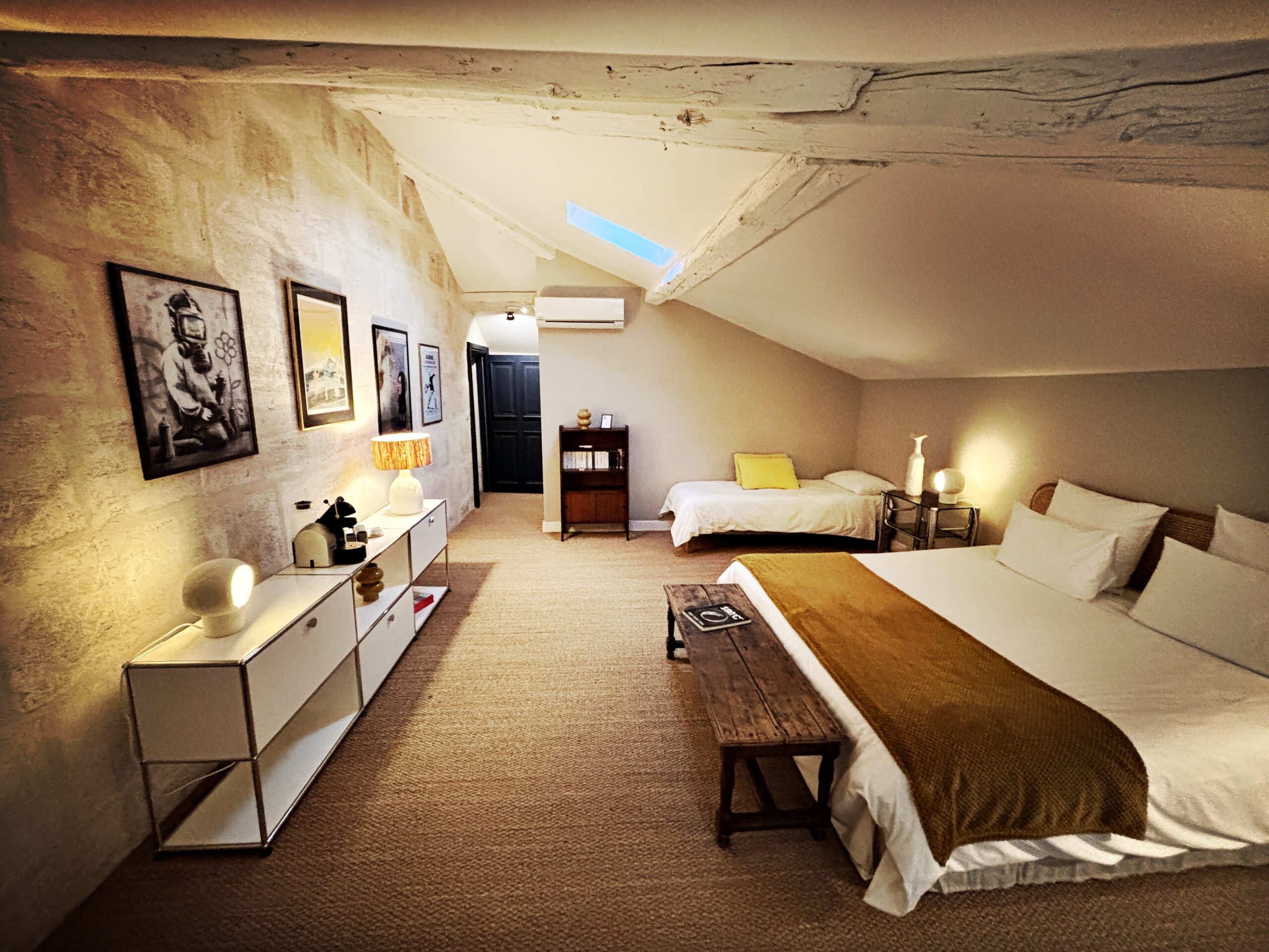 47m² située au deuxième étage, lit king size 180×200 et un lit 90×200, climatisation, cafetière Nespresso, mini réfrigérateur, coffre fort…